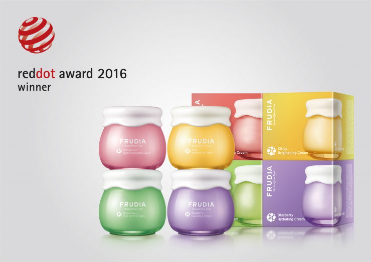 除了品牌獨家技術外,產品的包裝也是另一個廣受喜愛的重要因素。依據水果的特性與營養功效,FRUDIA推出五大水果保養系列,產品外觀以渾圓的果醬罐作為設計概念,瓶蓋的波浪造型,象徵用包裝紙封住手工果醬且每一種水果搭配不同色系,繽紛多彩同時兼具時尚質感,榮獲德國紅點設計大獎、韓國Good Design Award最優秀獎及多項產品外觀設計獎項,在韓國與世界各地都吹起一陣繽紛水果旋風。高顏值包裝不僅滿足文青少女們的拍照慾,同時強調全商品主要成份皆以水果萃取的天然成份,以及造型和色彩都十分繽紛的設計風格,絕對讓水果控消費者們荷包失守!